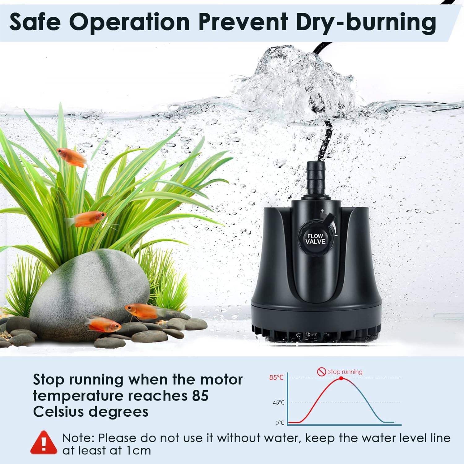 - 🐟🐟RUN DRY PROTECTION: The fountain pump motor reaches the certain temperature(85 degrees Celsius)will stop working without water, but the motor will restart working after the temperature goes down.(Note: Can't be operated in a waterless environment)