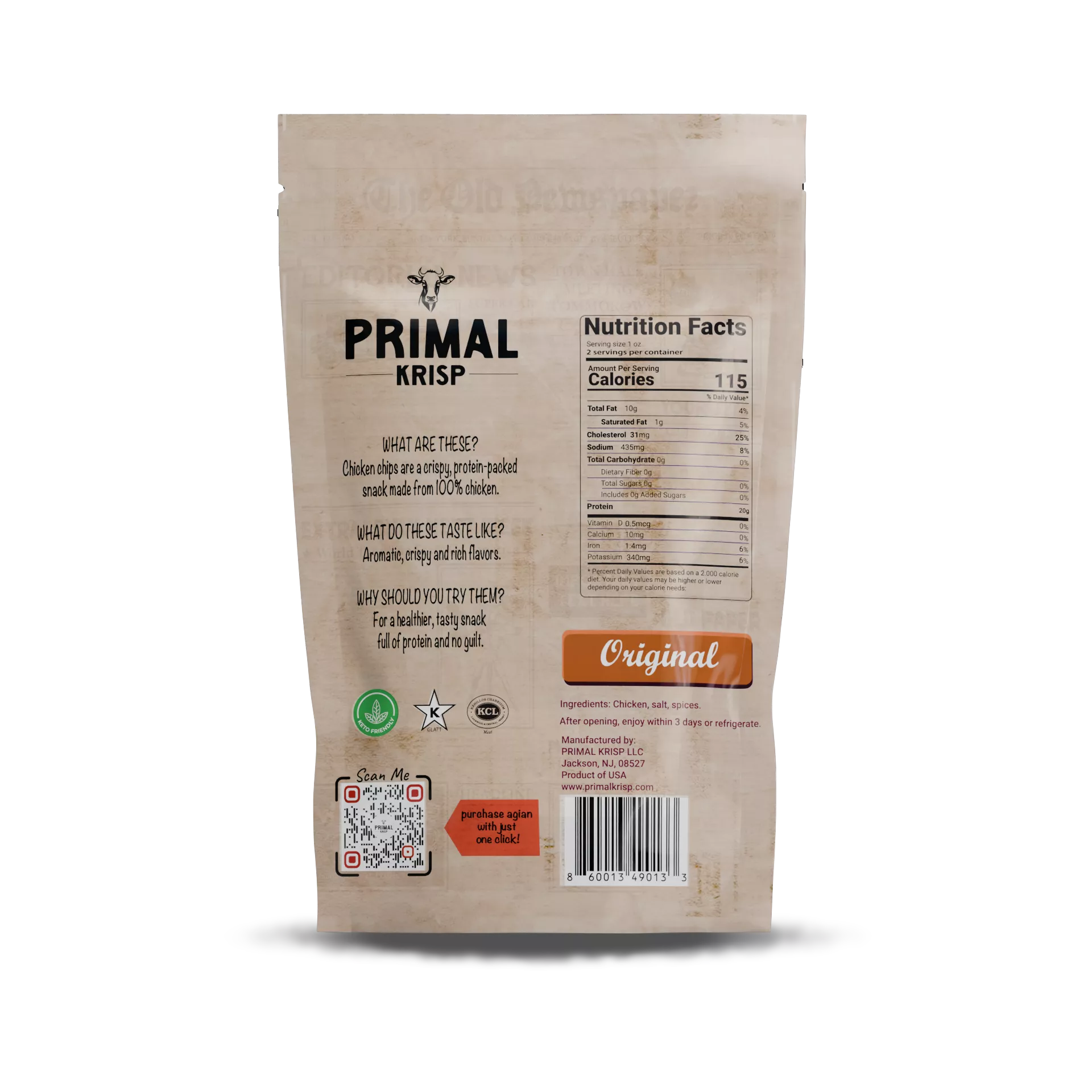 Made from real chicken, Chicken: Original chips offer a savory, protein-packed alternative to traditional snacks. Free from additives and sugar, they deliver pure, natural goodness in every bite.