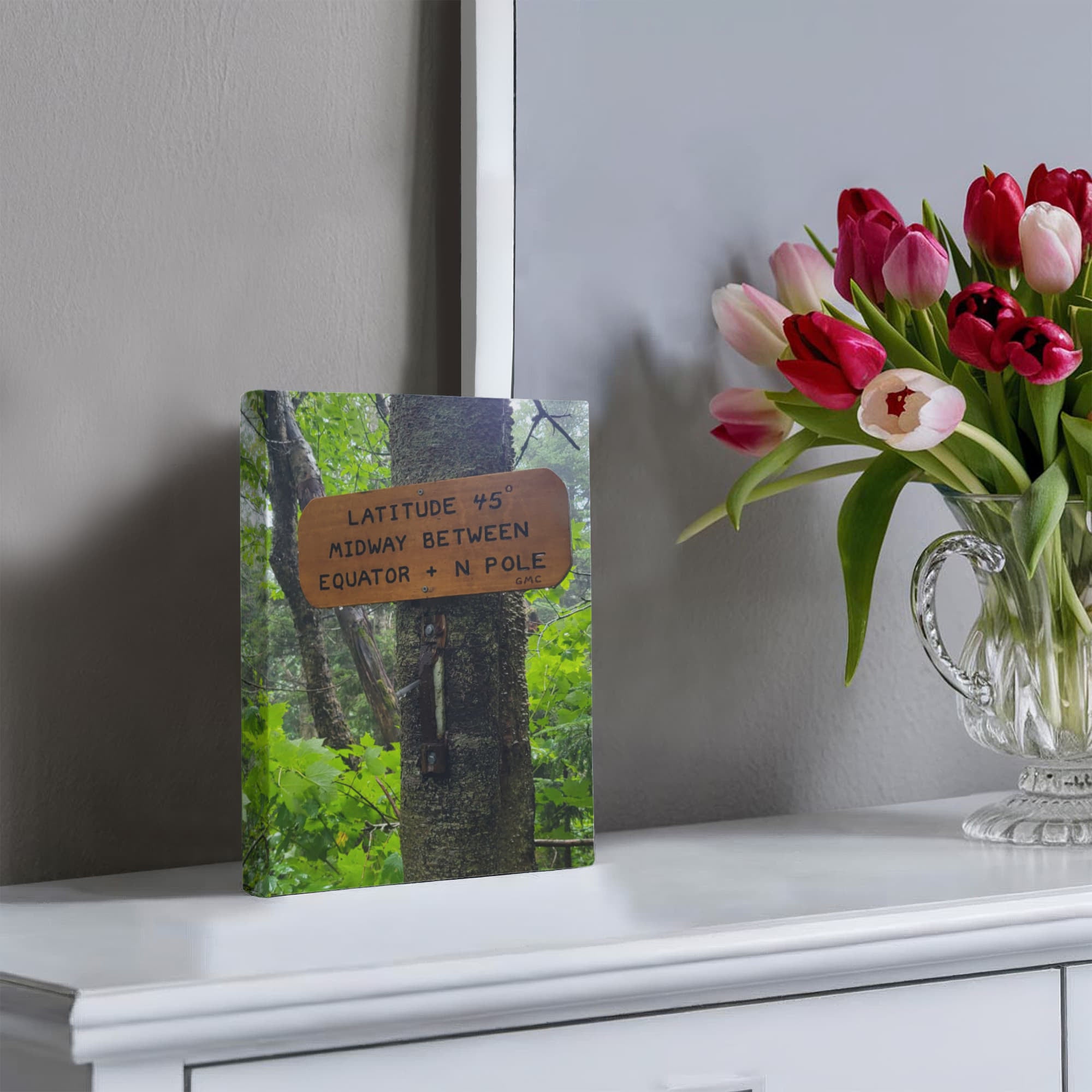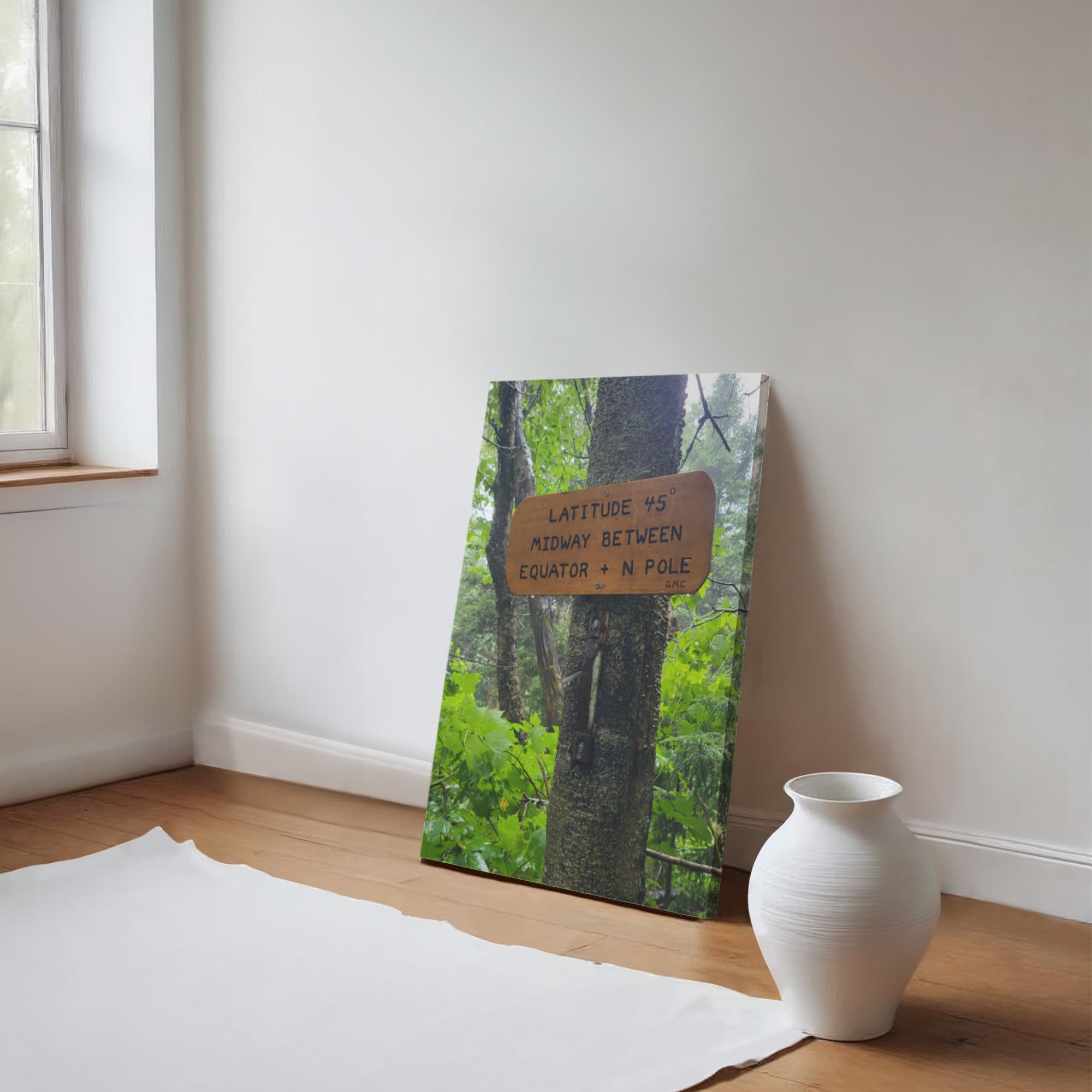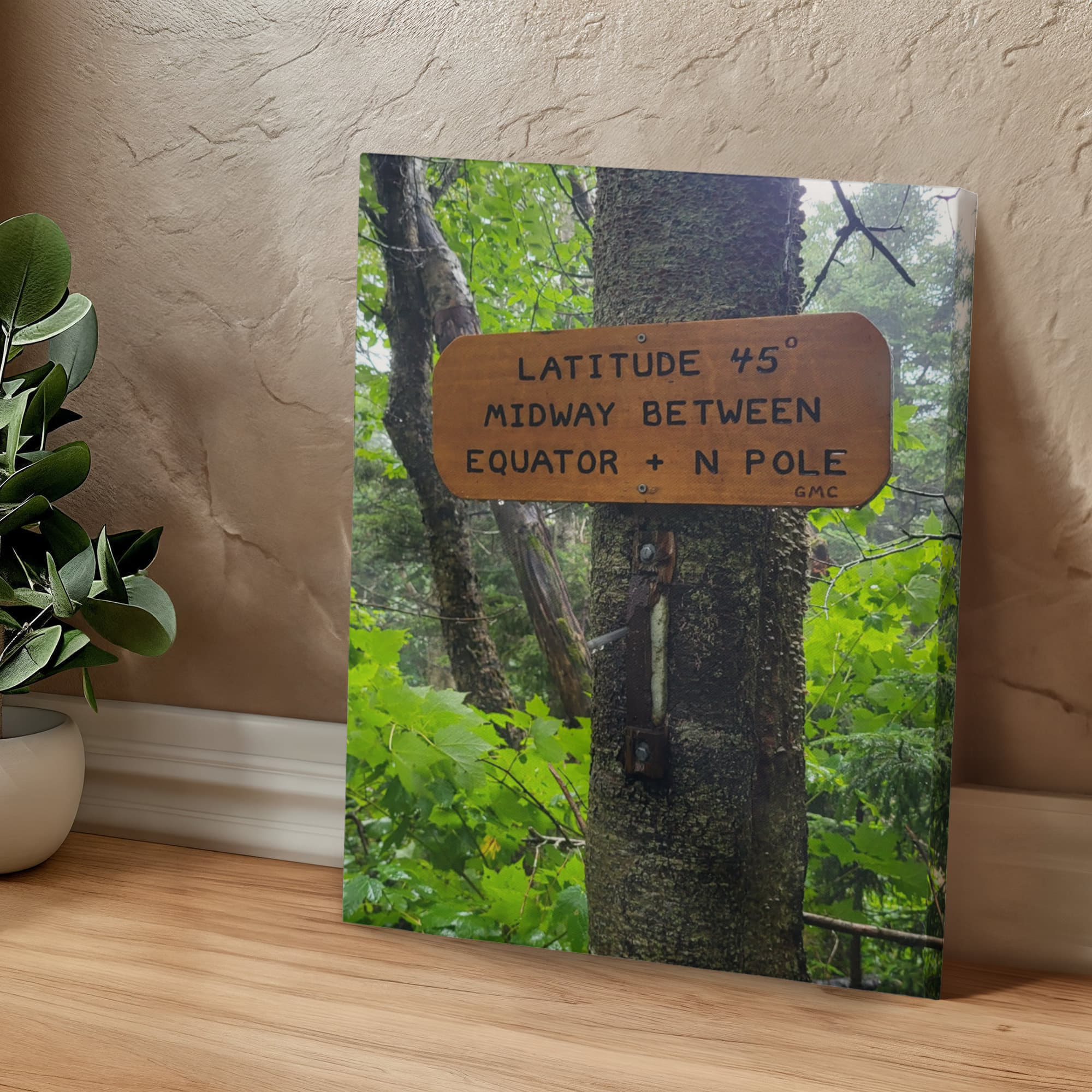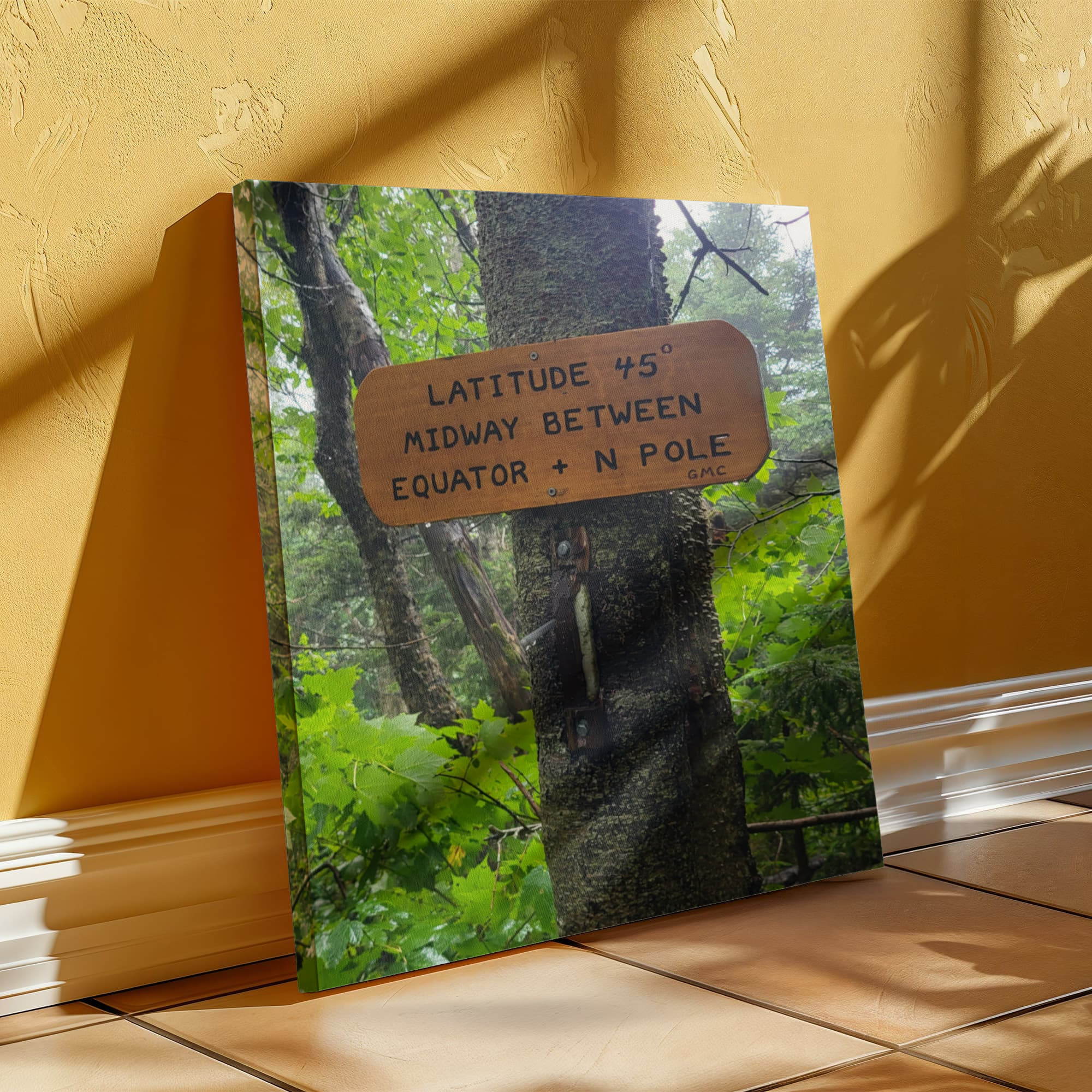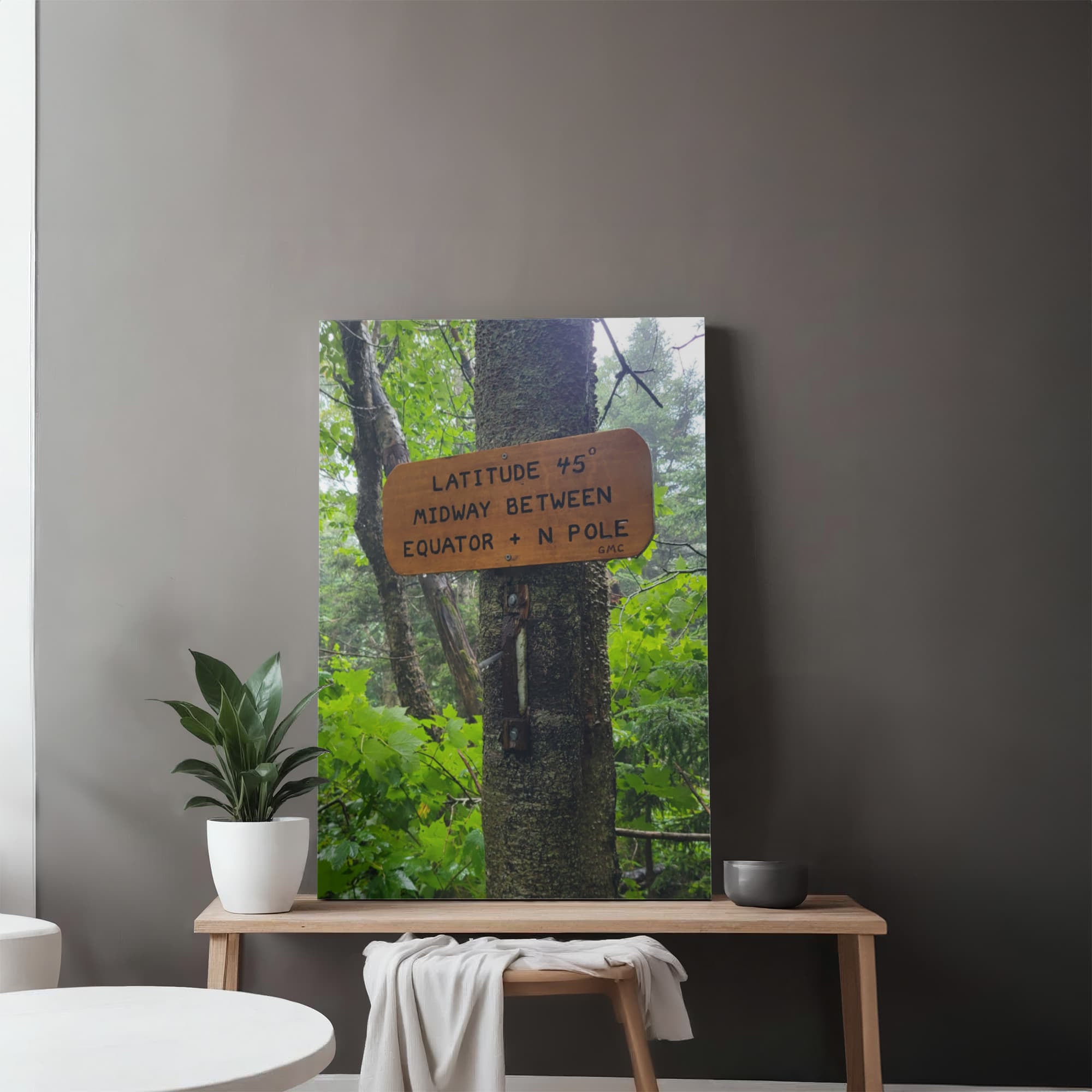 This rustic trail sign marks a significant geographic milestone—standing exactly halfway between the Equator and the North Pole. A reminder of the vastness of our planet, discovered in the heart of Vermont's wilderness.