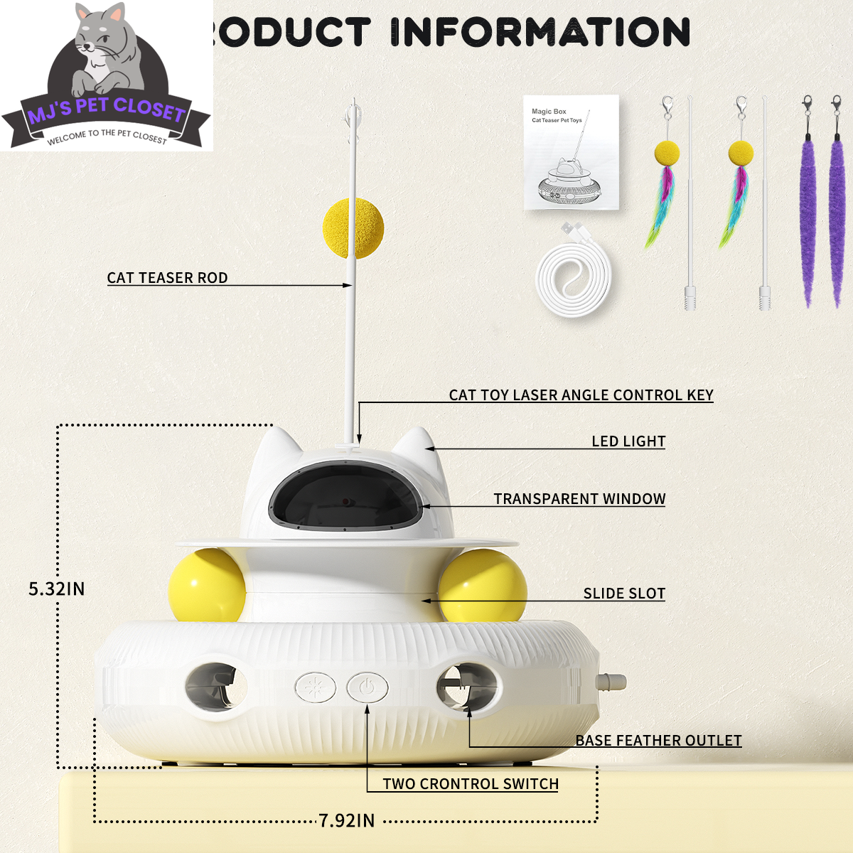 Get ready to elevate your indoor cat's playtime with our 4-in-1 Interactive Cat Toys! Featuring a 360° laser pointer, an automatic feather wand, a rotating track ball toy, and popping mole feathers – boredom be gone!