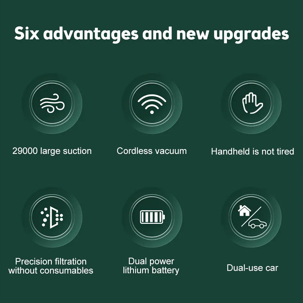 Experience unmatched cleaning convenience with the Wireless Handheld Vacuum, a powerful 29000PA suction device designed for efficiency and ease. This cordless, hand-held appliance ensures a thorough cleaning experience both in your home and your vehicle.